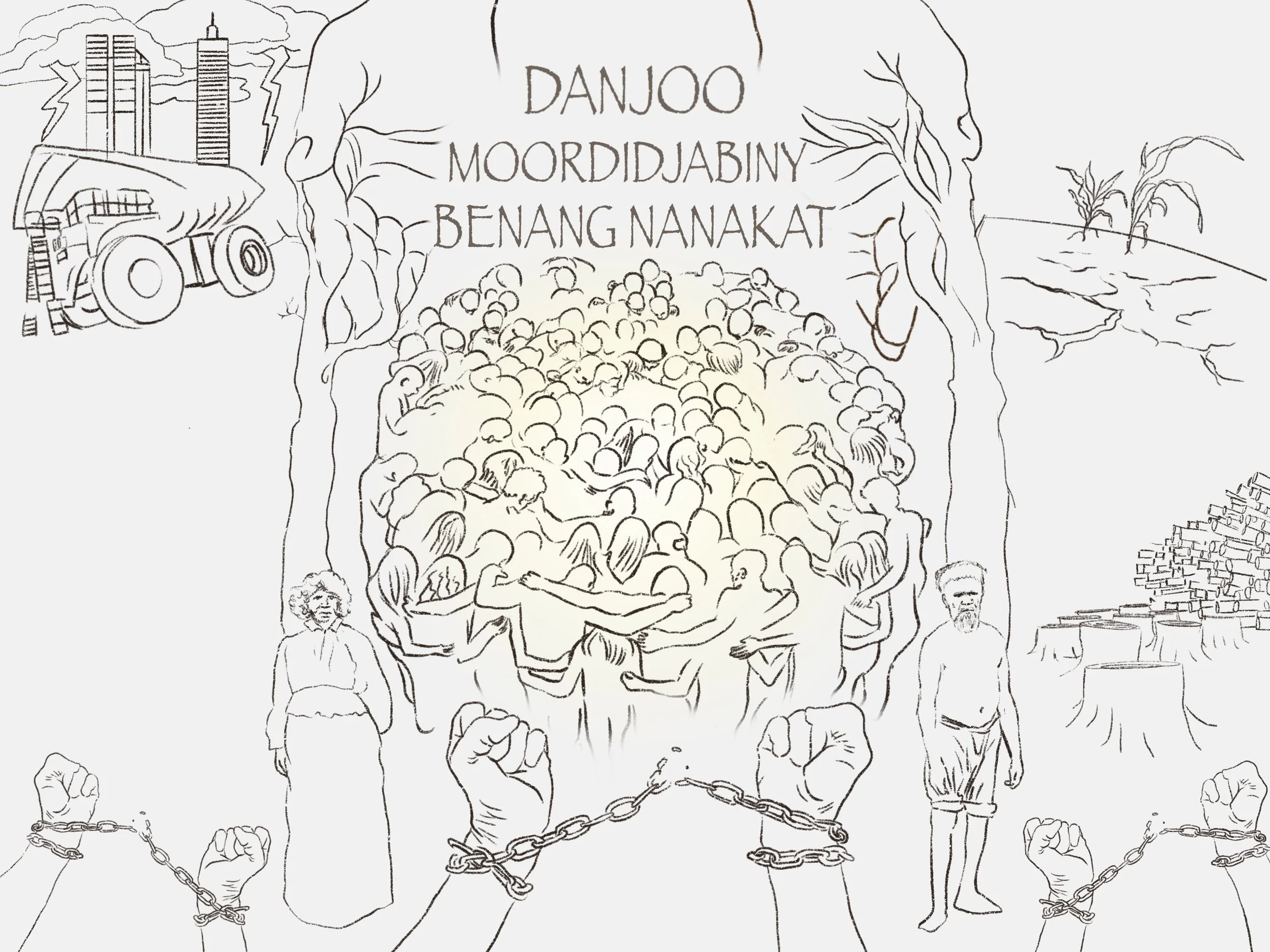 The painting carries two titles: Narbiny nguluk nidja doorntj baarniny, moorditj dooytj-doornt (Care together, strong together), an expression in Noongar of resistance grounded in unity and compassion; and Rakyat Bersatu tak bisa dikalahkan (The People united cannot be defeated), an Indonesian protest slogan that resonates with global social justice movements.
